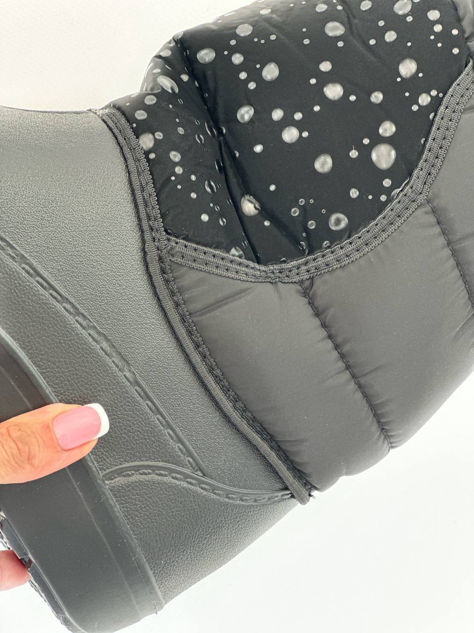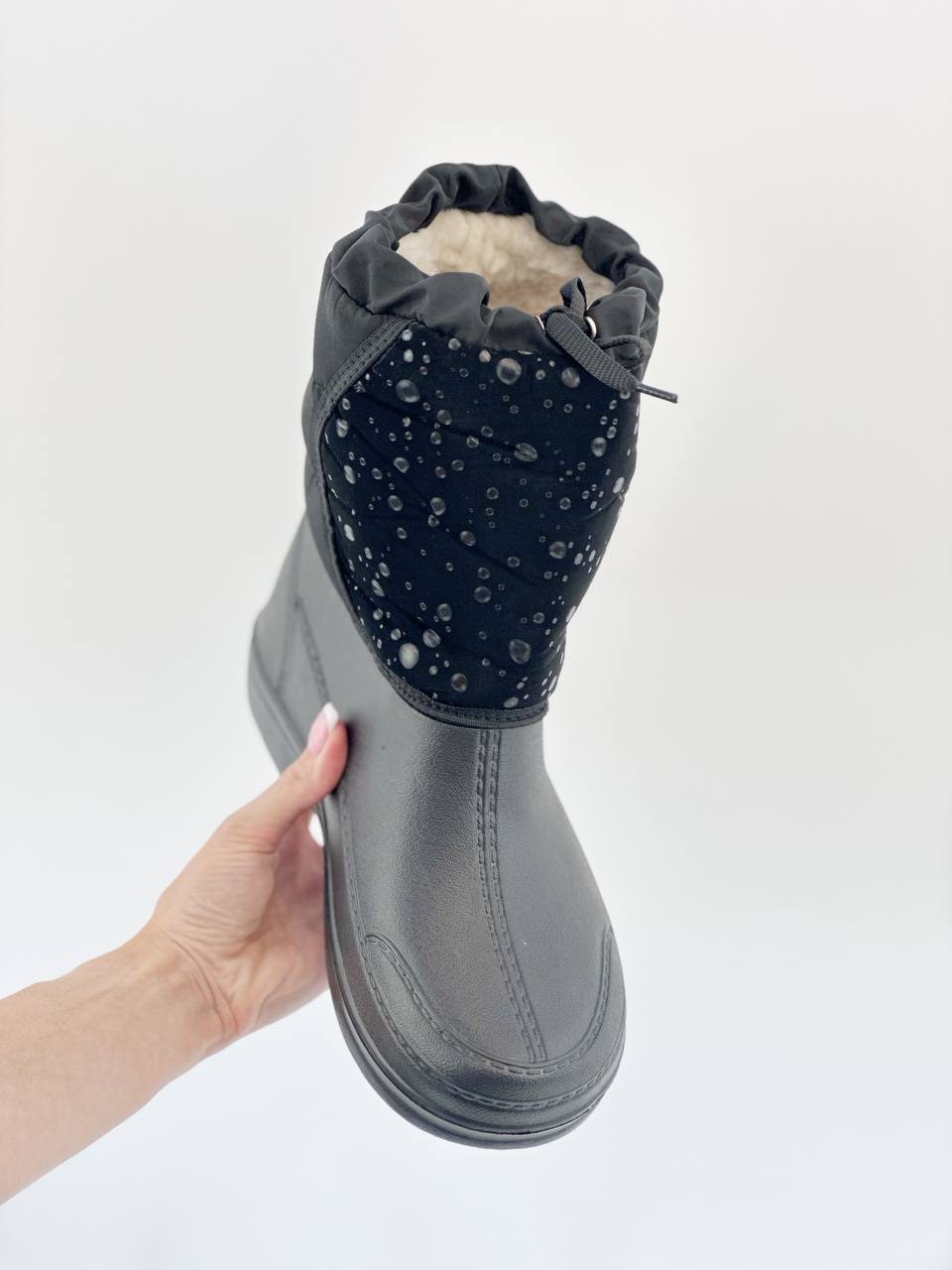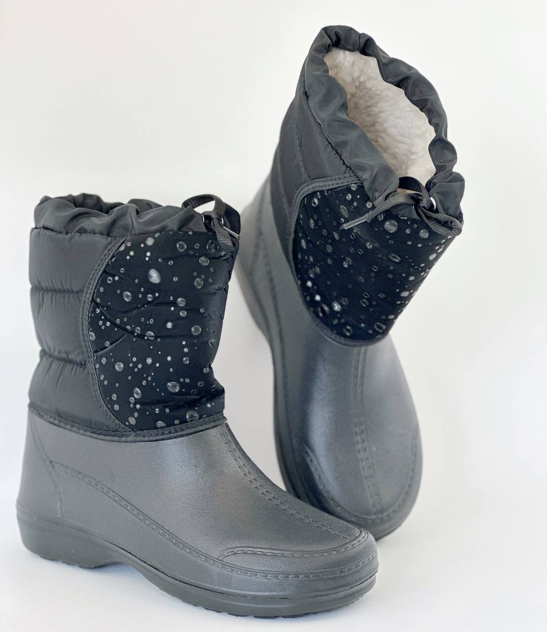 Універсальний варіант – від холоду і сльоти Похмура осінь … Мокра весна … Сніжна зима … У черевиках занадто сиро, а в гумових чоботах ноги просто мерзнуть. Вам знову не в чому ходити? Не турбуйтеся: якраз для такої примхливої погоди і придумані демісезонні жіночі комбіновані чоботи – “Тайга”! Чому їх варто полюбити? · По-перше, верх чобота з щільного текстилю – не тільки оберігає ноги від холоду, але і відмінно виглядає в поєднанні з зимовим одягом. · По-друге, нижня частина, яка закриває стопу, зроблена литним методом- з дуже легкого, пружного і водонепроникного сучасного матеріалу ЕВА – і щільно пришита до верхньої частини чобота. · А за додаткову м’якість і тепло відповідає підкладка зі штучного хутра. · Жіночі чоботи “Тайга” – взуття для тих, хто любить тримати ноги в теплі і сухості!