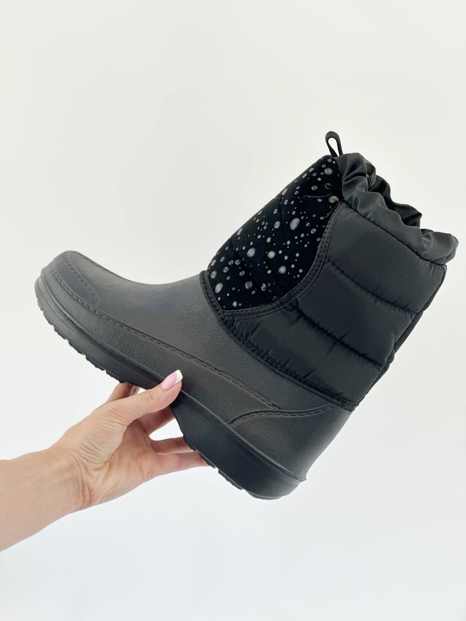 Універсальний варіант – від холоду і сльоти Похмура осінь … Мокра весна … Сніжна зима … У черевиках занадто сиро, а в гумових чоботах ноги просто мерзнуть. Вам знову не в чому ходити? Не турбуйтеся: якраз для такої примхливої погоди і придумані демісезонні жіночі комбіновані чоботи – “Тайга”! Чому їх варто полюбити? · По-перше, верх чобота з щільного текстилю – не тільки оберігає ноги від холоду, але і відмінно виглядає в поєднанні з зимовим одягом. · По-друге, нижня частина, яка закриває стопу, зроблена литним методом- з дуже легкого, пружного і водонепроникного сучасного матеріалу ЕВА – і щільно пришита до верхньої частини чобота. · А за додаткову м’якість і тепло відповідає підкладка зі штучного хутра. · Жіночі чоботи “Тайга” – взуття для тих, хто любить тримати ноги в теплі і сухості!